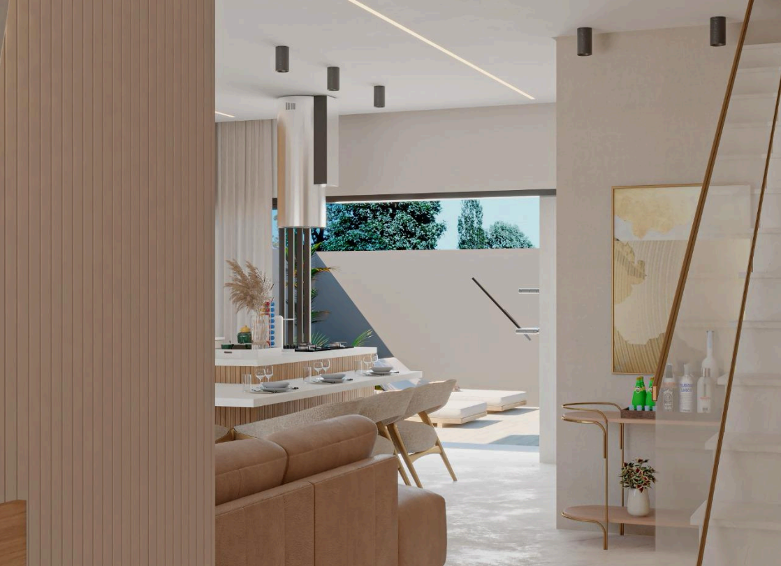 Living amplo, com grandes aberturas. Ambiente interno integrado com a área gourmet na parte dos fundos e ainda uma área de aproximadamente 4 metros para lazer. Abertura de 8,49 metros, garagem para 4 carros, sendo 2 cobertas e 2 descobertas. Já o pavimento superior possui 3 suítes. Todos os ambientes bem espaçosos e ventilados.