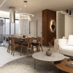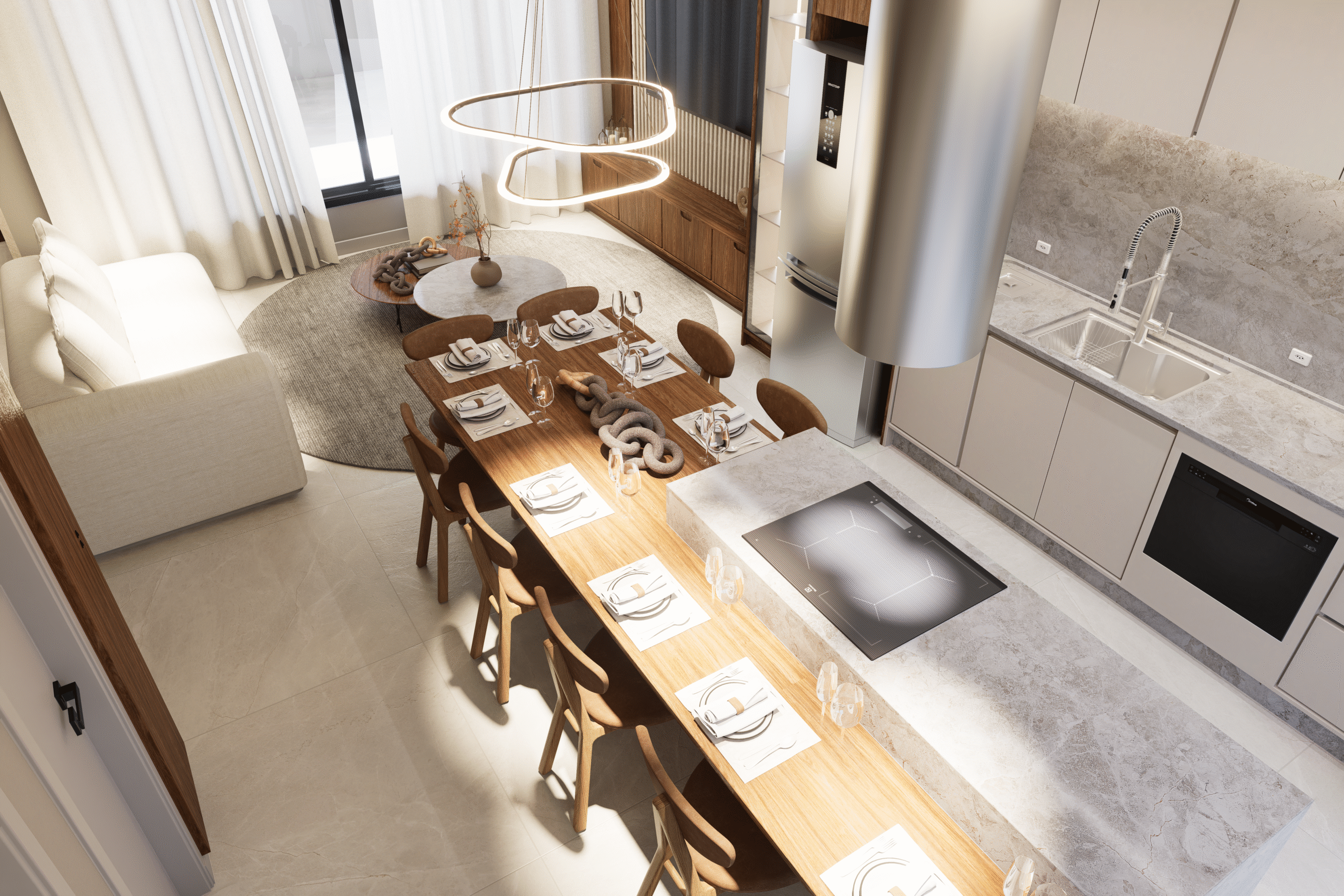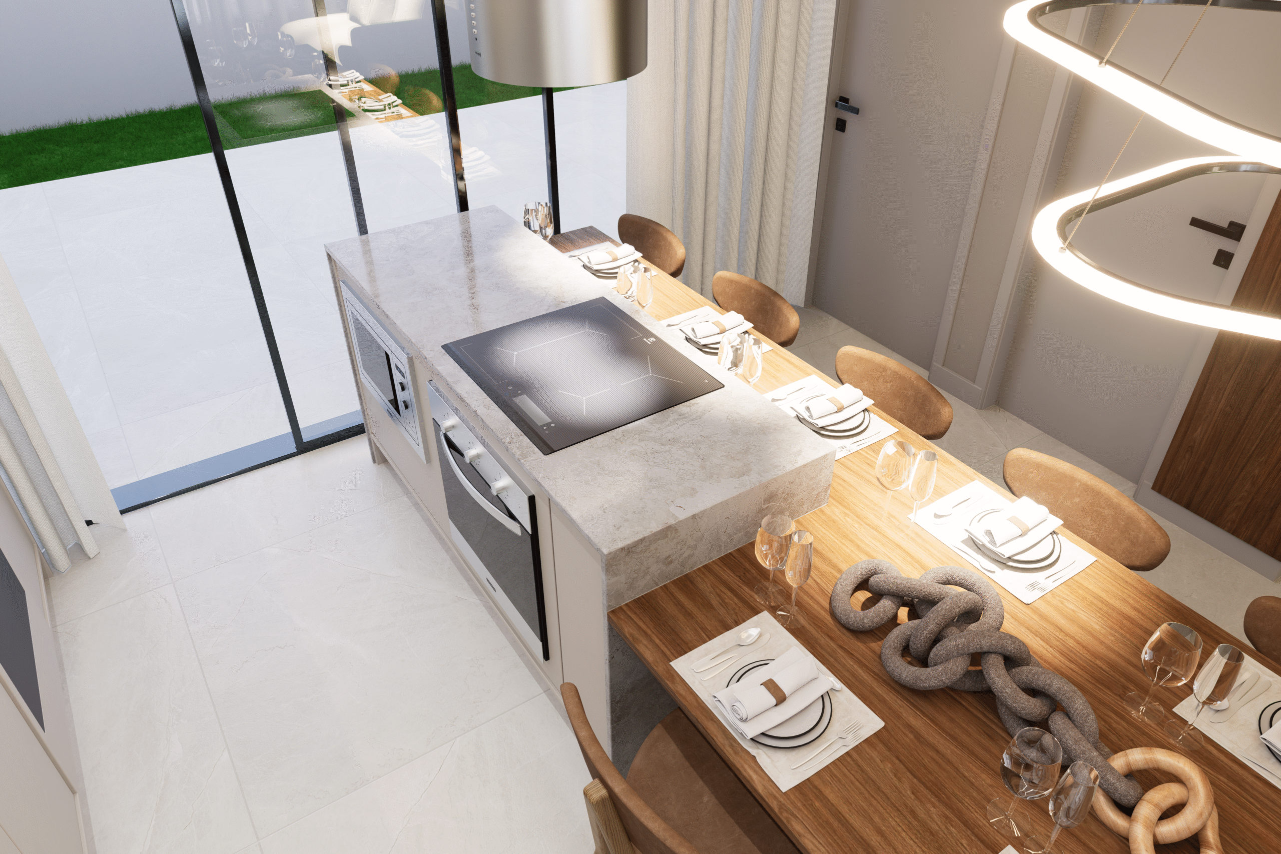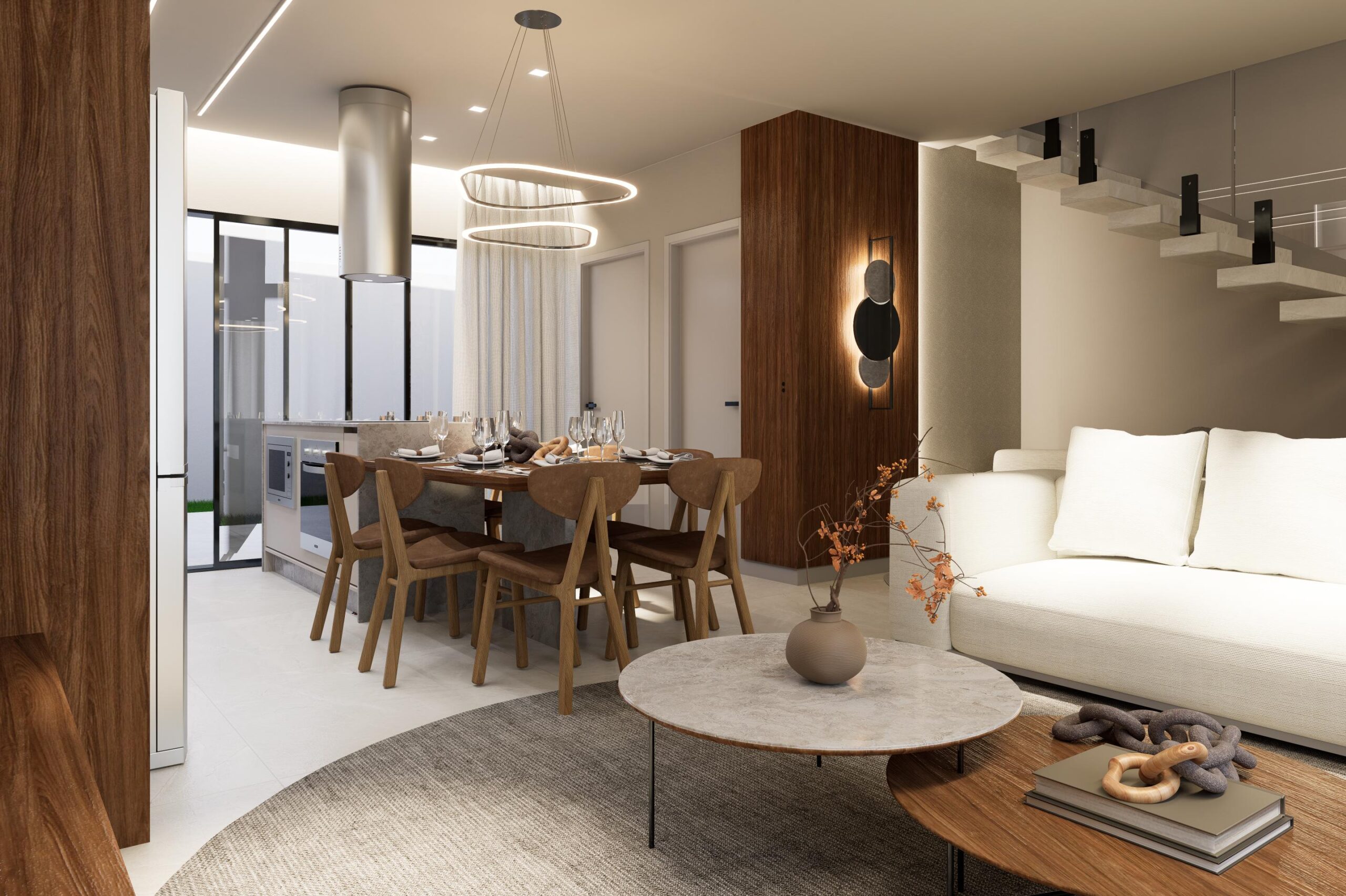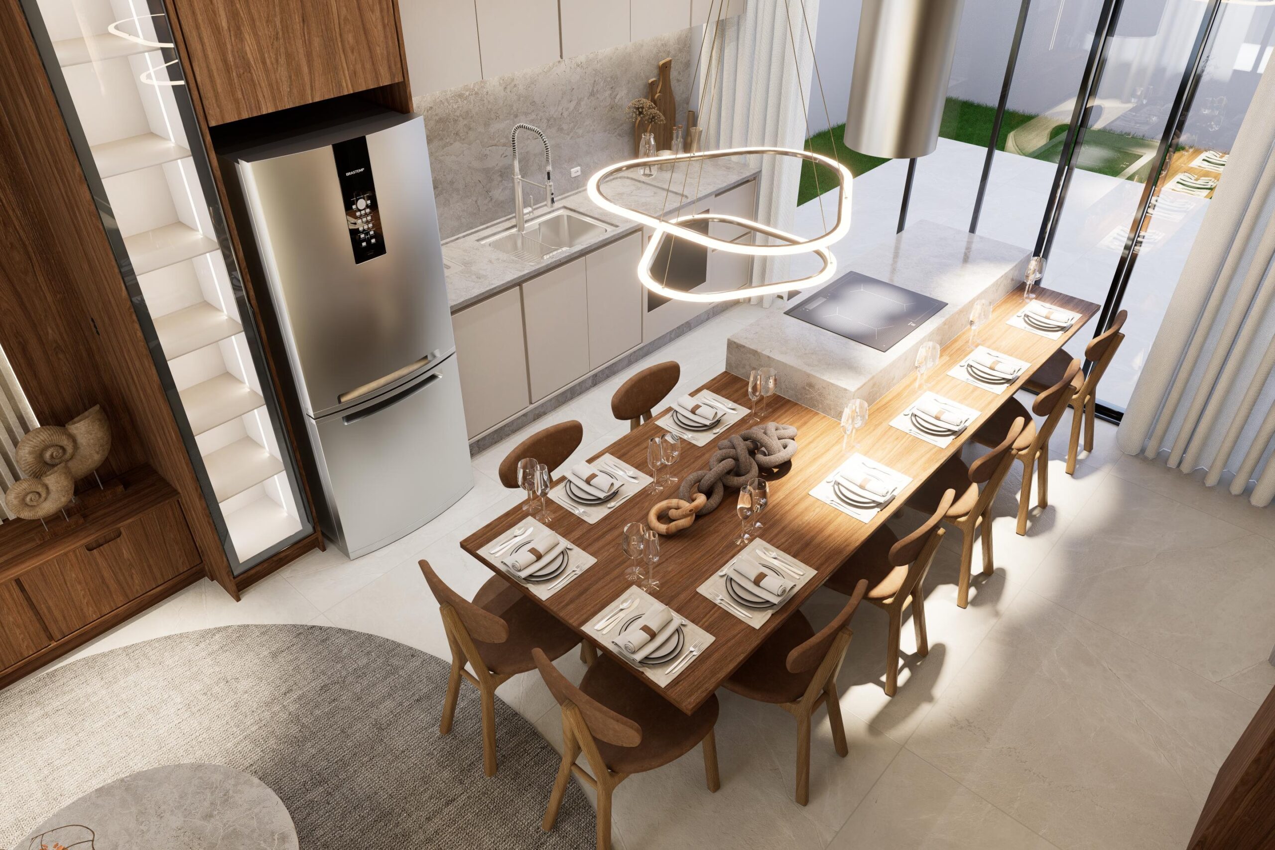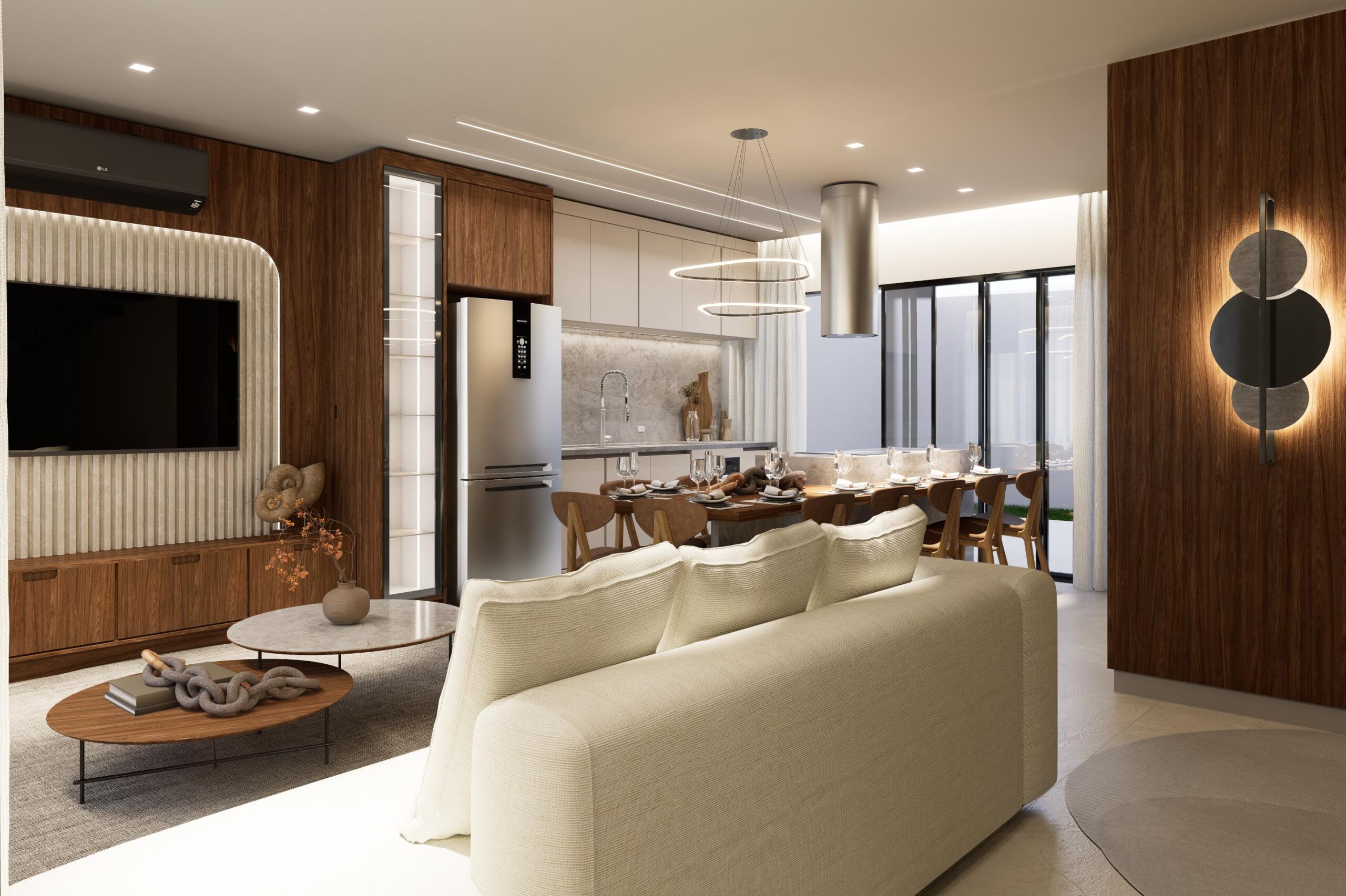 Living amplo, com grandes aberturas. Ambiente interno integrado com a área gourmet na parte dos fundos e ainda uma área de aproximadamente 4 metros para lazer.